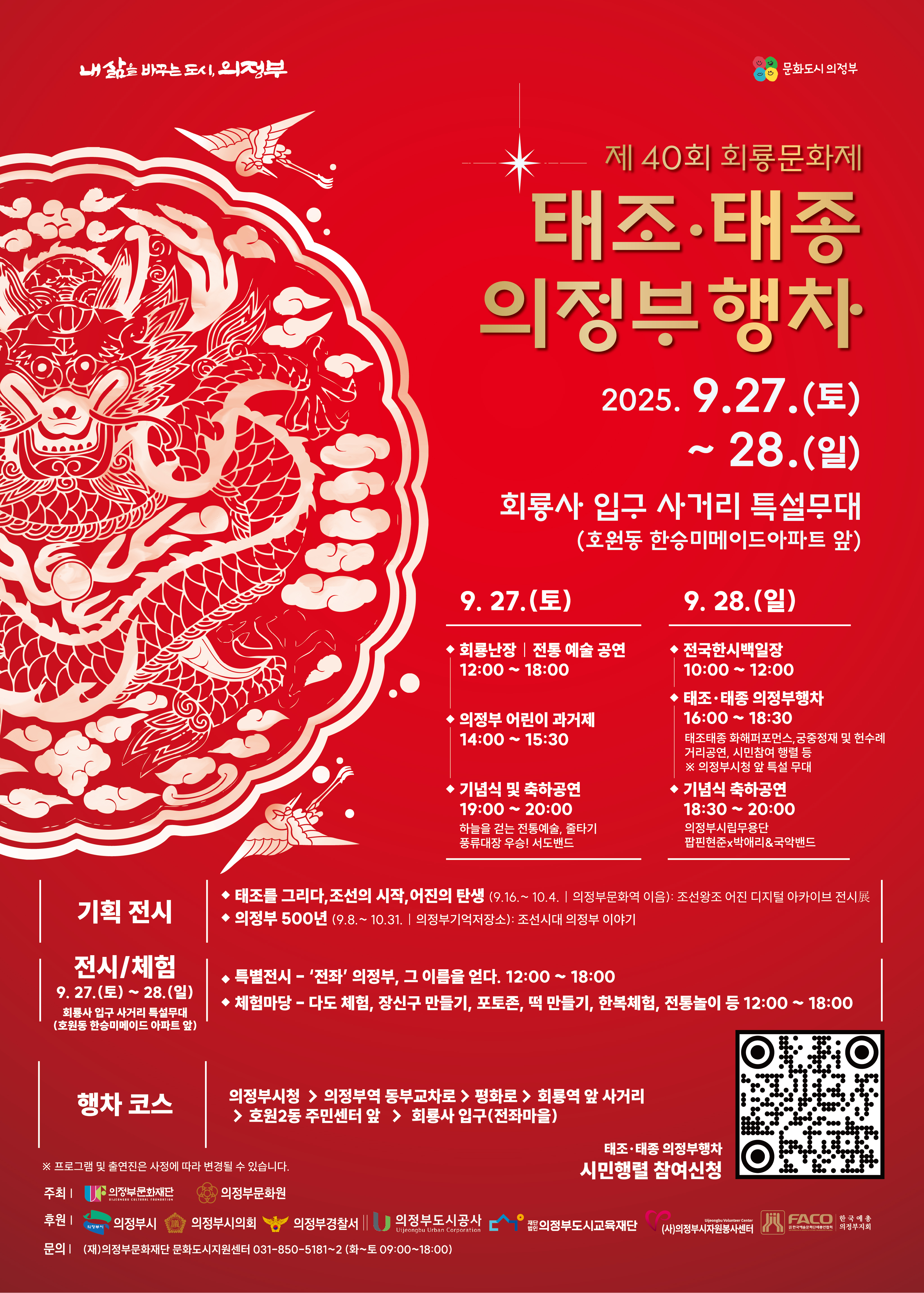 제40회 회룡문화제 ‘태조-태종 의정부행차 / 2025. 9. 27. (토) ~ 28. (일) / 회룡사 입구 사거리 특설무대(호원동 한승미메이드아파트 앞) 작성일 2025-09-05 10:31 조회 161 목록보기