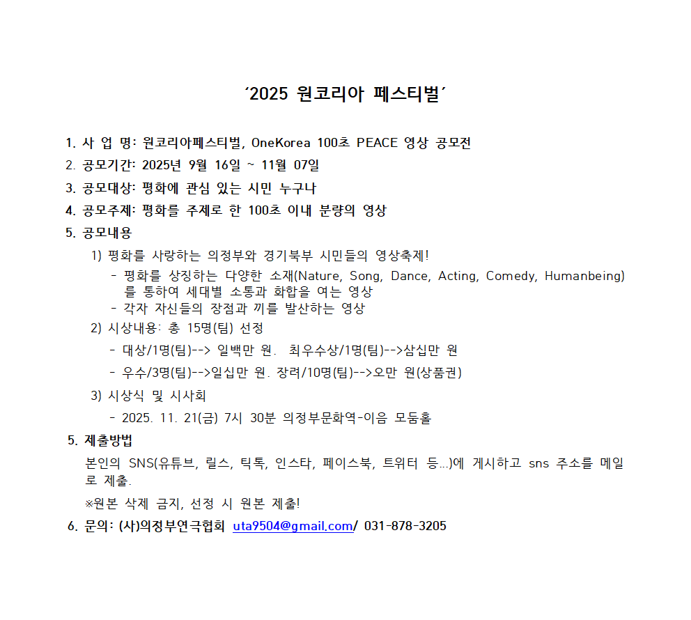 원코리아페스티벌 ‘100초 영상 공모전’ / 2025.09.16.(화) ~ 11.07.(금) 18:00 마감